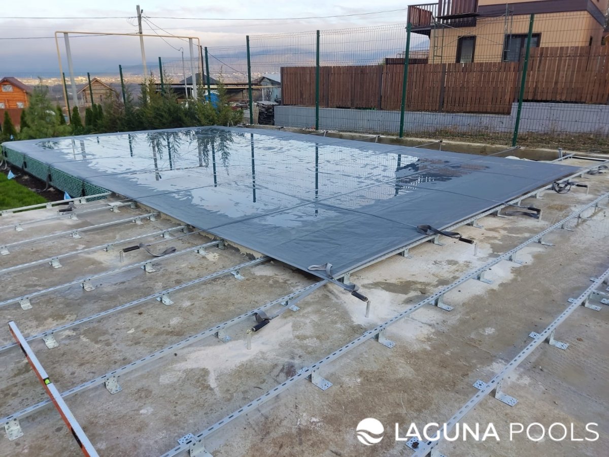 Металлическая подсистема с глянцевым покрытием установлена на бетонном основании возле бассейна.